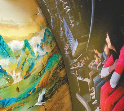 經過近一年的鉆研,方特突破多個技術難關,打造出國內首個中國畫球幕飛翔影院項目——《飛越千里江山》。作品獨創“飛行觀畫”模式,讓游客得以感受現代科技與文化瑰寶融合迸發的嶄新魅力。