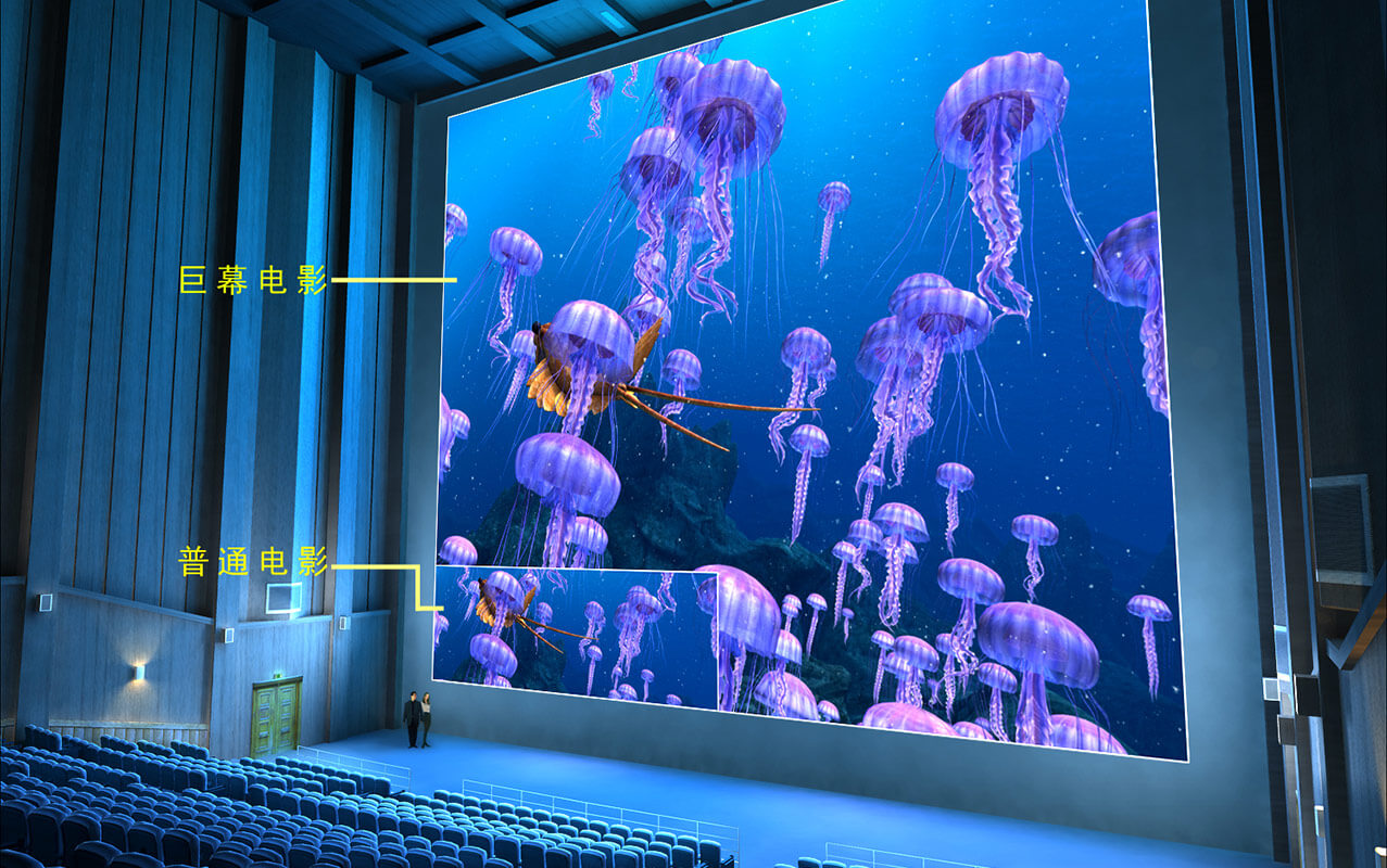 巨幕影院,擁有長60米高16米的大型立體銀幕,弧形銀幕加以個性化的觀看角度設計充分擴展觀眾的外圍視野,影院觀眾席可容納1000人。